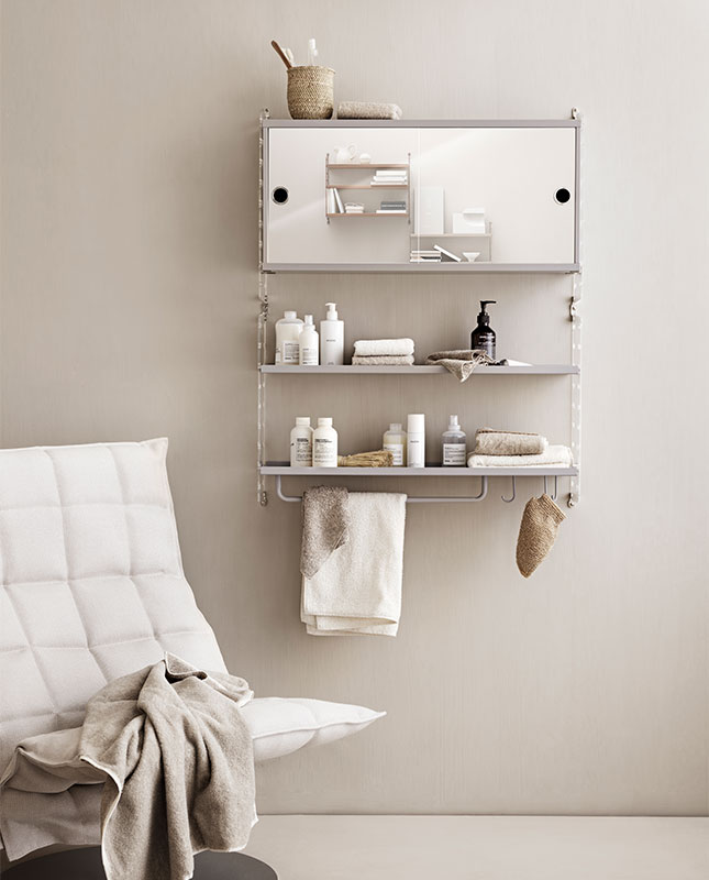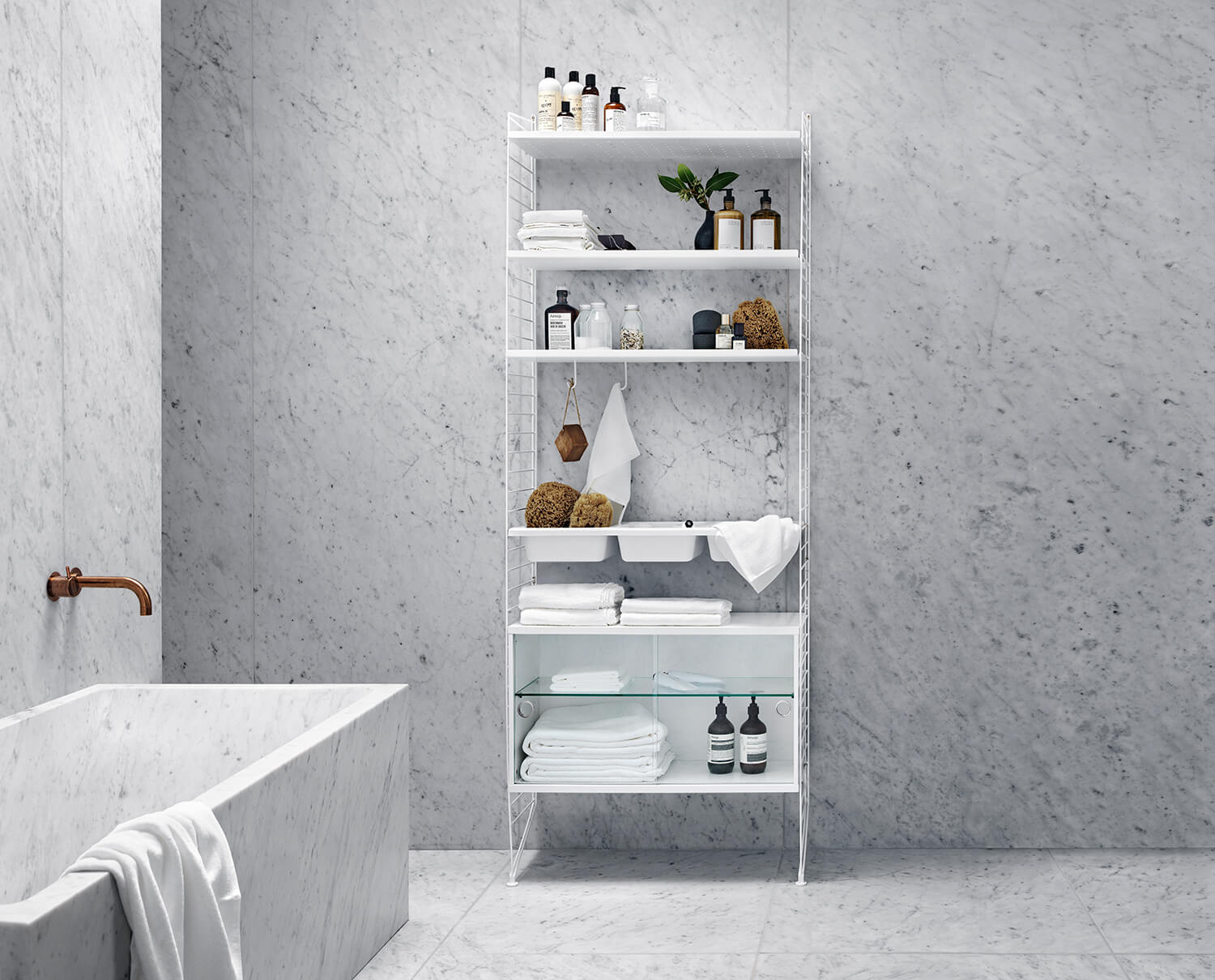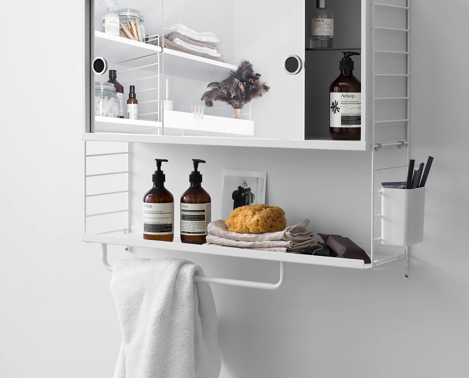 Med en Stringhylde i dit badeværelse kan du opnå en flot, slank og designet opbevaring til en rimelig pris. Et tip til indretning af det lille og trange badeværelse er at undgå store skabe under håndvasken. Indtrykket bliver nemt tungt og overmøbleret. Brug i stedet pladsen over håndvasken eller væggen over toilettet til opbevaring med et String badeværelsesskab.