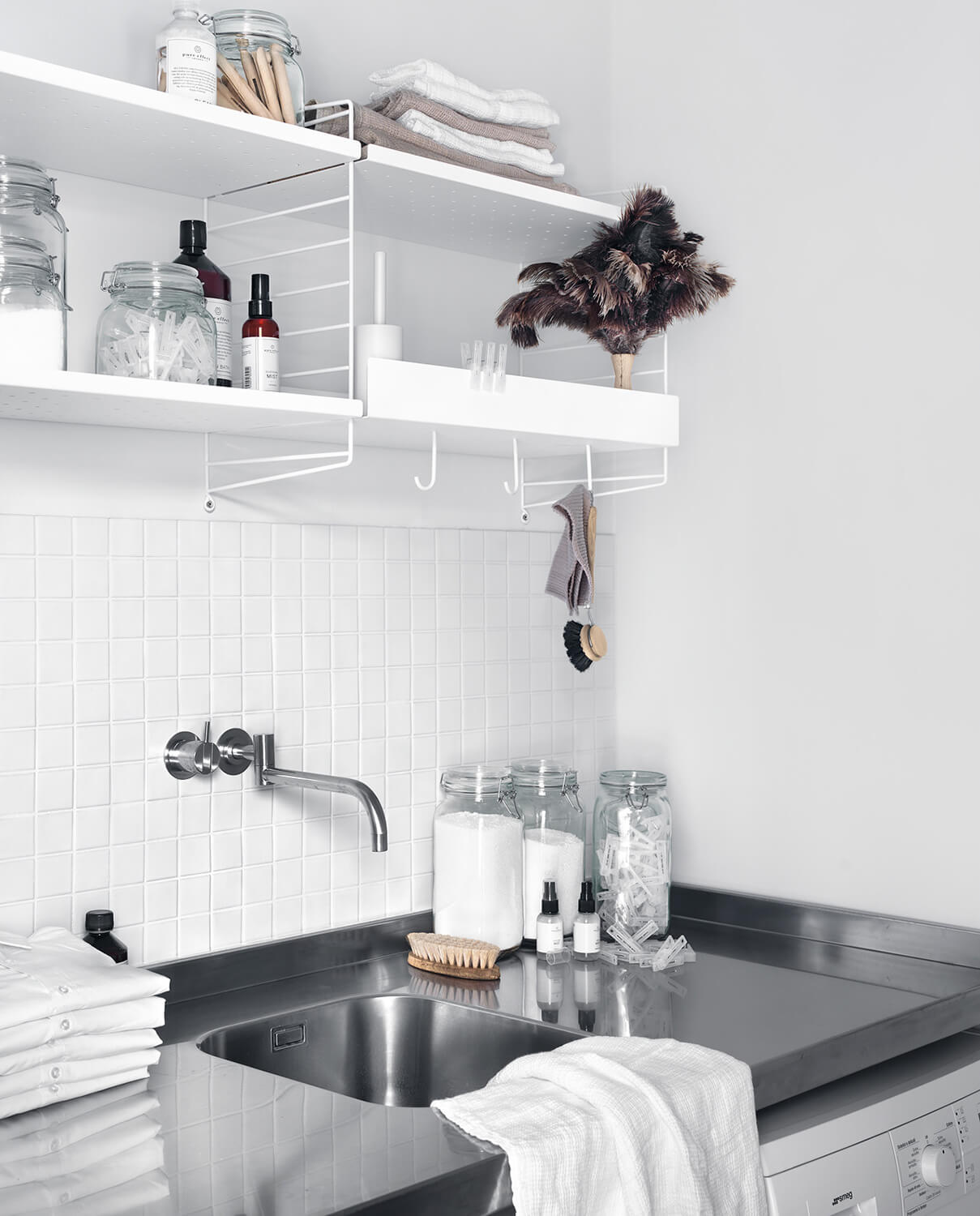 Er stressende morgener en daglig oplevelse for dig? Organiser din opbevaring i badeværelset med en hylde fra String. Brug alle de smarte dele med String, som kan gøre hverdagen lidt nemmere. Design en høj Stringhylde, der er gulvstående, og som har plads til mange forskellige af de smarte opbevaringsløsninger, der findes. Monter flere hyldeplaner, så hver familiemedlem kan få sin egen hylde at holde styr på. Placer børnenes hylder langt nede på sektionen, så de nemt kan nå deres ting, og placér de voksnes hyldeplaner højere op, hvor parfumeflasker og andre skrøbelige genstande kan opbevares.