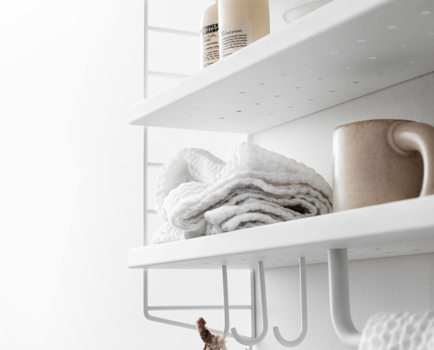 Genkender du det, at våde håndklæder og shampooflasker ender på badeværelsesgulvet - i stedet for på deres rette pladser? Det kan nemt undgås med String opbevaring i dit badeværelse. I badeværelset vælger du med fordel din Stringhylde i metal, da den er fugtbestandig og let at aftørre. Metalhylderne i String System er perforerede, så du nemt kan fastgøre ophængningskroge og stænger hvor som helst på hylden. Badeværelseshylder i metal fås med lav kant og høj kant. Afhængigt af hvad du ønsker at opbevare på hylderne, kan du med fordel blande mellem de forskellige modeller.