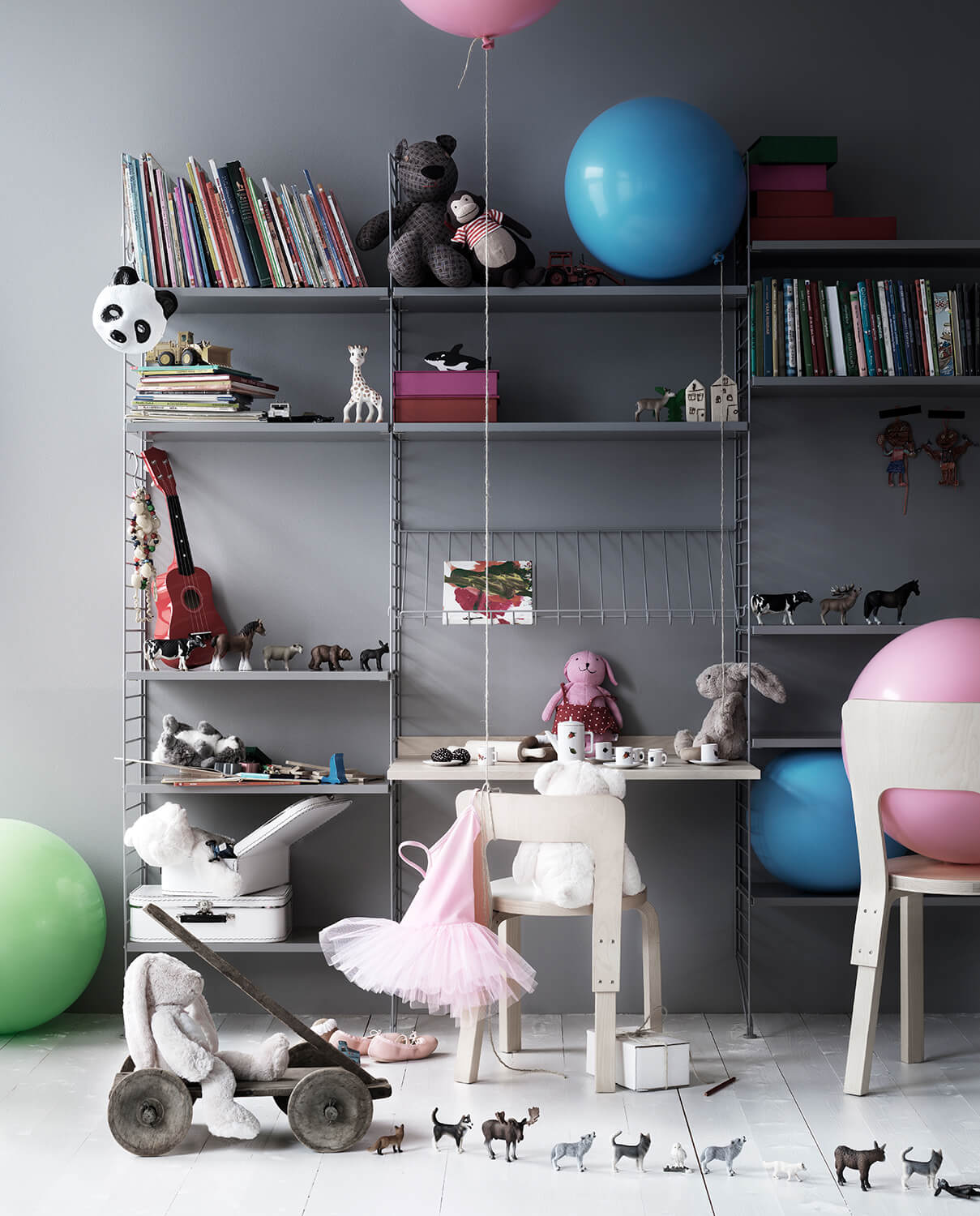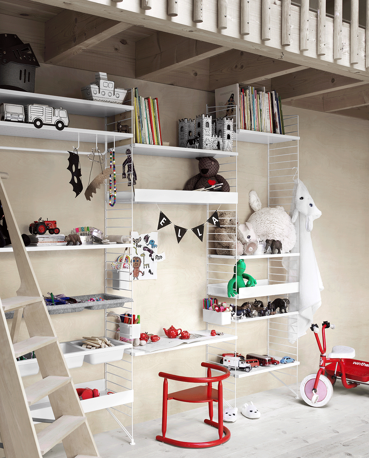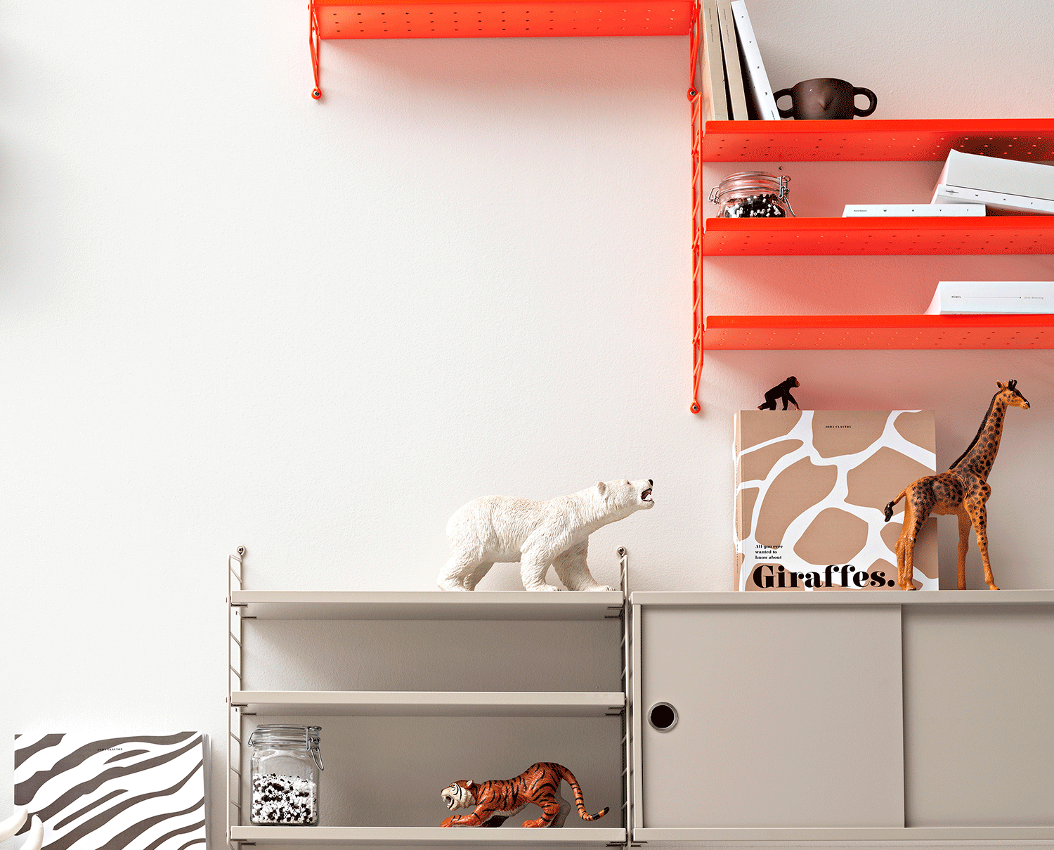 Stringreolen – det sidste dit barn vokser fra. Børneværelset er et sted for leg. Rummet skal mellem legene være funktionelt. Det er muligt at vælge møbler, der inspirerer til leg, samtidig med at de inspirerer til et funktionelt miljø. String tilbyder funktionelle opbevaringsløsninger, også for de mindste i familien. Et reolsystem fra String System kan følge dit barn gennem alle aldre. Det er nemt at udvide eller reducere systemet med en side eller en hylde. String gør det nemt at skabe et miljø, der inspirerer til leg og oprydning – både for dig og dit barn.
