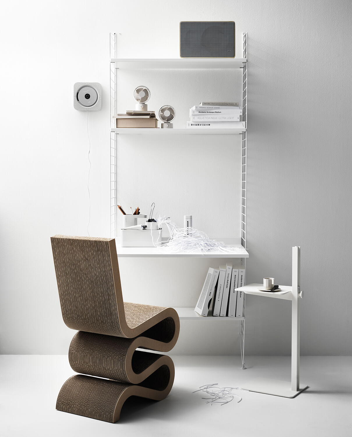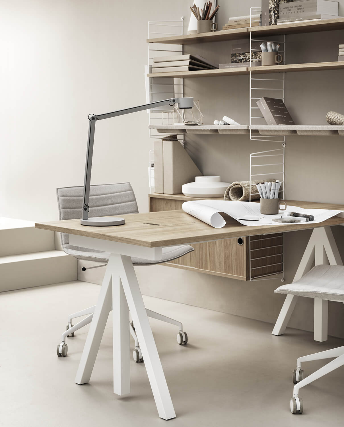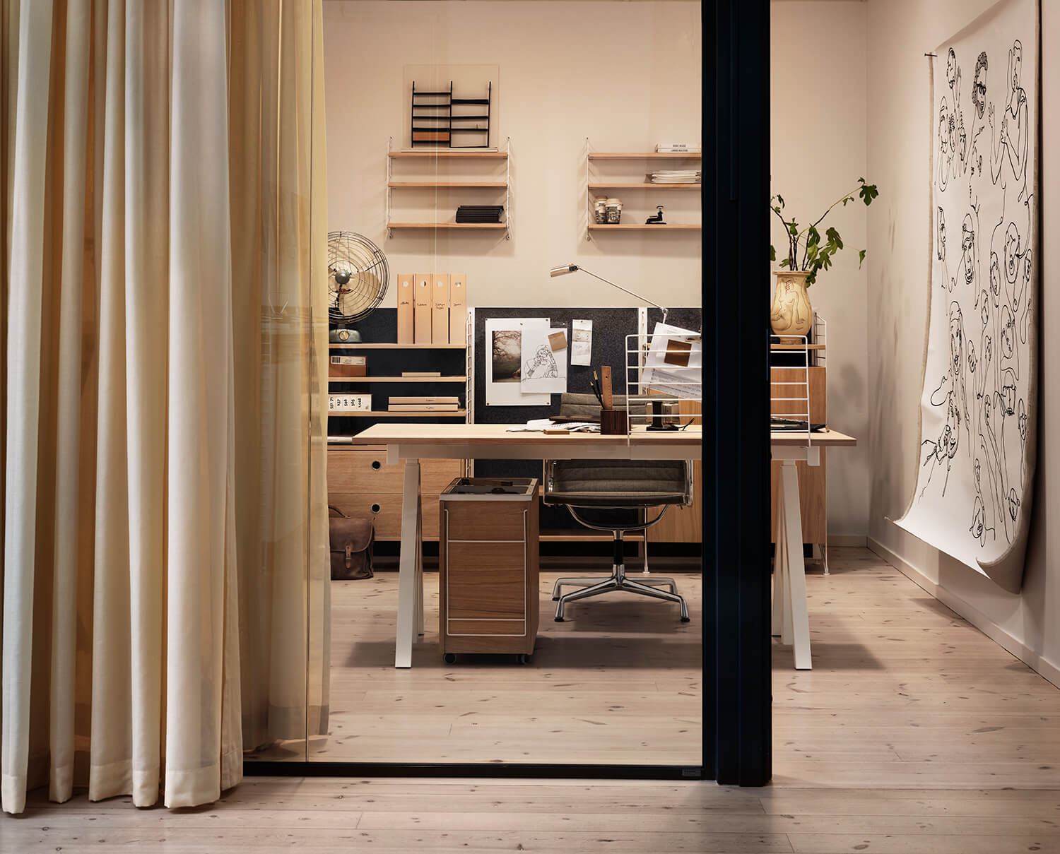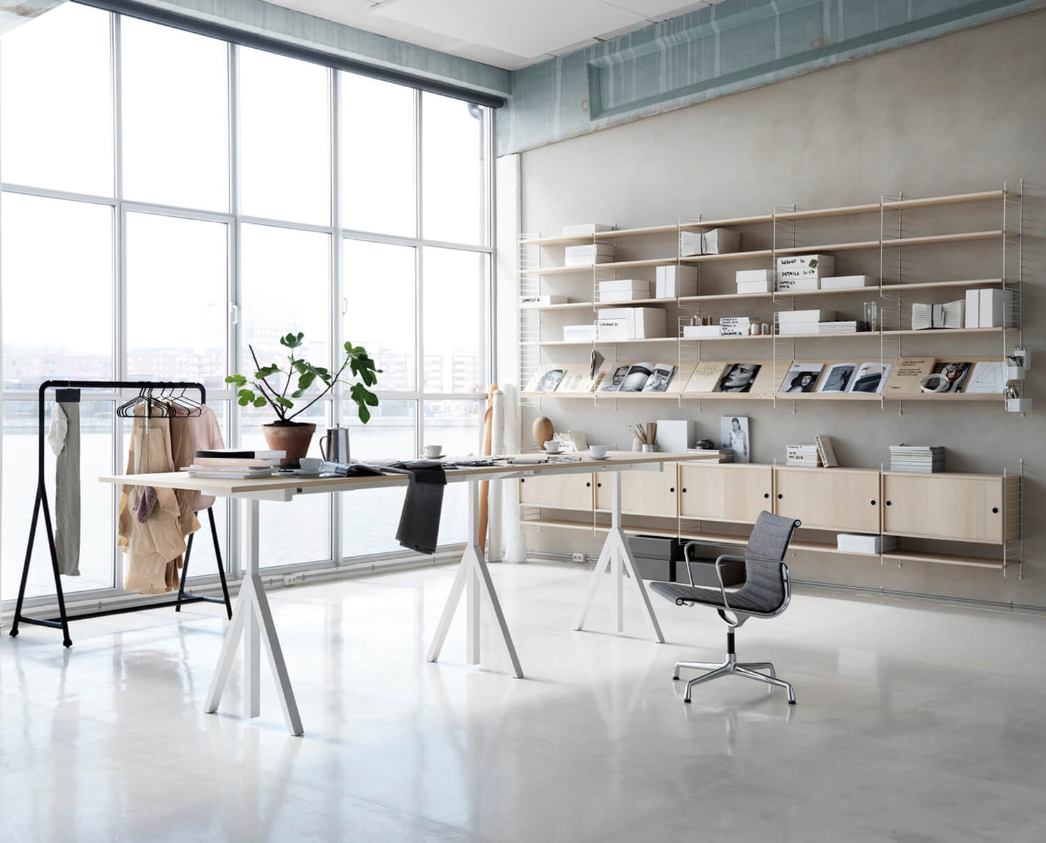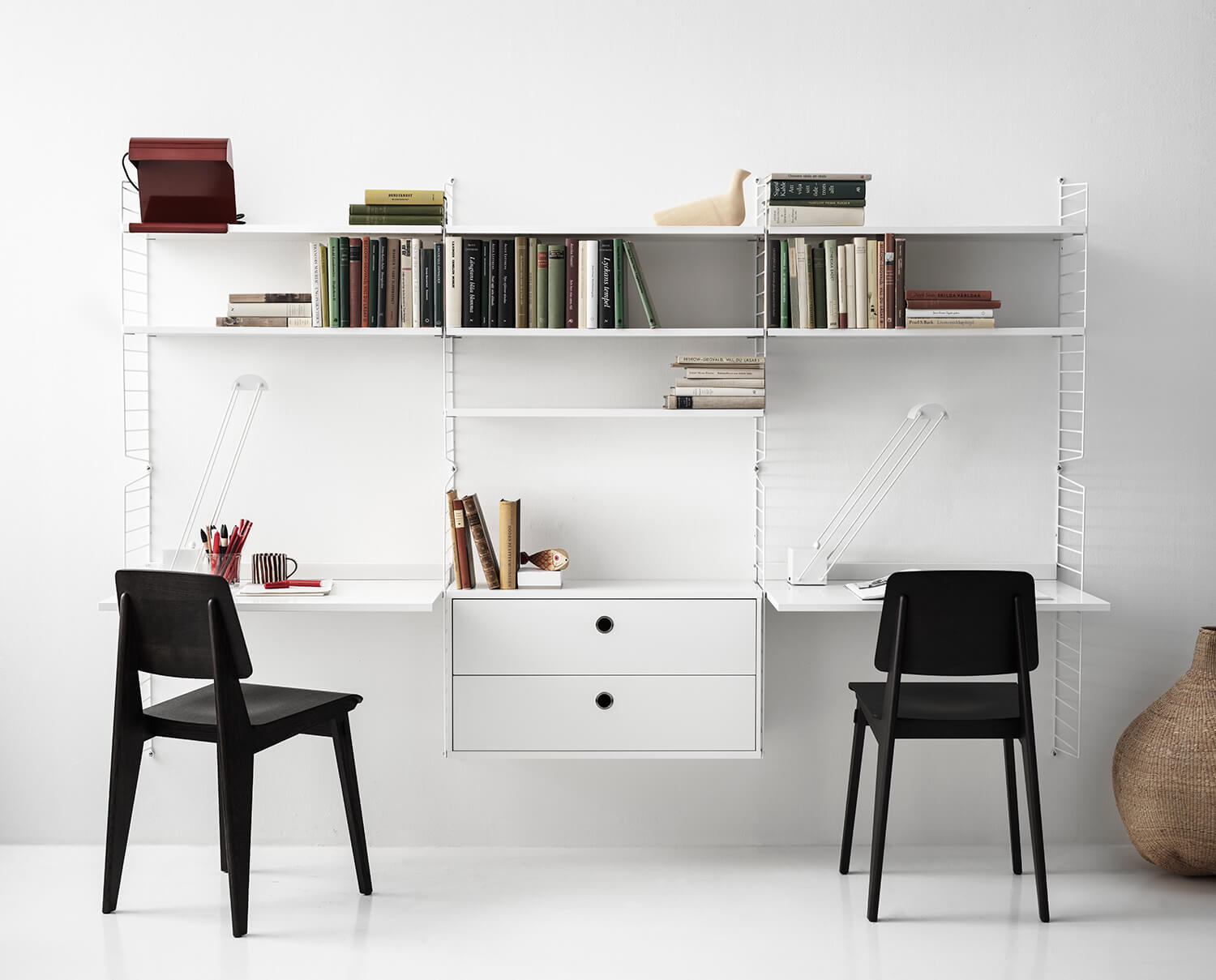 For at skabe en funktionel og behagelig arbejdsplads er en bestemt plads nødvendig. Det kan være et isoleret rum, i stuen, soveværelset eller et sted, hvor rummet er ubrugt. Her skal du kunne komme og gå uden at skulle pakke dit arbejde op og ned. Skrivebordet skal give masser af arbejdsplads, så du har plads til at bevæge dig frit. Gode opbevaringsmuligheder er en vigtig aspekt for at kunne skabe orden ved skrivebordet. Strings hylder tilbydes i forskellige størrelser og kan monteres på gavlene efter eget ønske. Hylderne er perfekte til at opbevare ringbind, opbevaringsbokse, kurve og bøger. Desuden tilbyder sortimentet String Works mere tilpasset opbevaring til skrivebordet og arbejdssteder som organisatorer og skrivebordsskuffe.