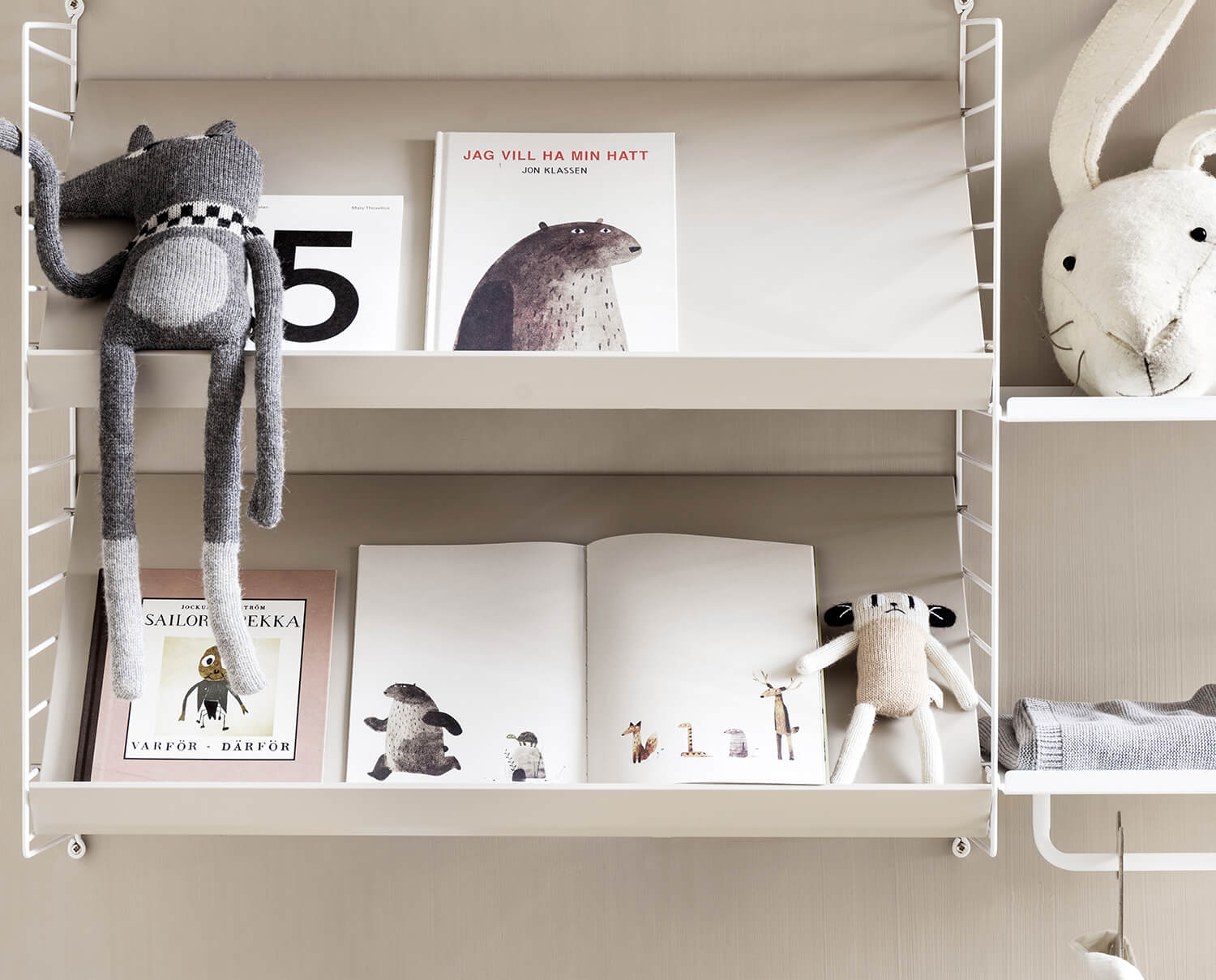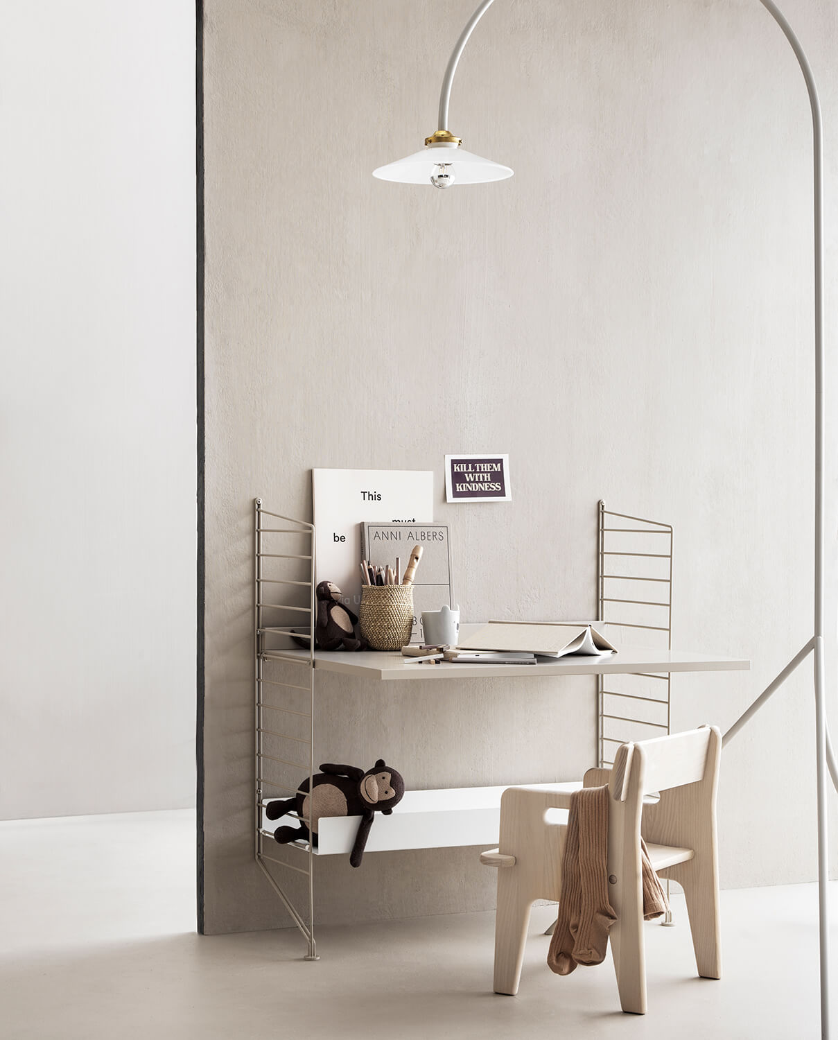 Fordelen ved Strings system er, at modulerne kan tilpasses efter alder og behov. Det ikoniske design passer lige så godt i et børneværelse som i et teenageværelse. Da modulerne kan fastgøres på siderne på forskellige niveauer, kan skrivebordspladen eller hyldeniveauet også justeres efter barnets egen højde. Her kan Strings skriveplade kombineres med lave gulvgavler for at skabe et skrivebord til børn. Kombiner skrivebordet med hylder og Strings magasinreol til opbevaring af børnebøger og bamser. Kombiner skrivebordet med dit barns favoritstol for at skabe et hyggeligt sted at tegne og lave håndværk.