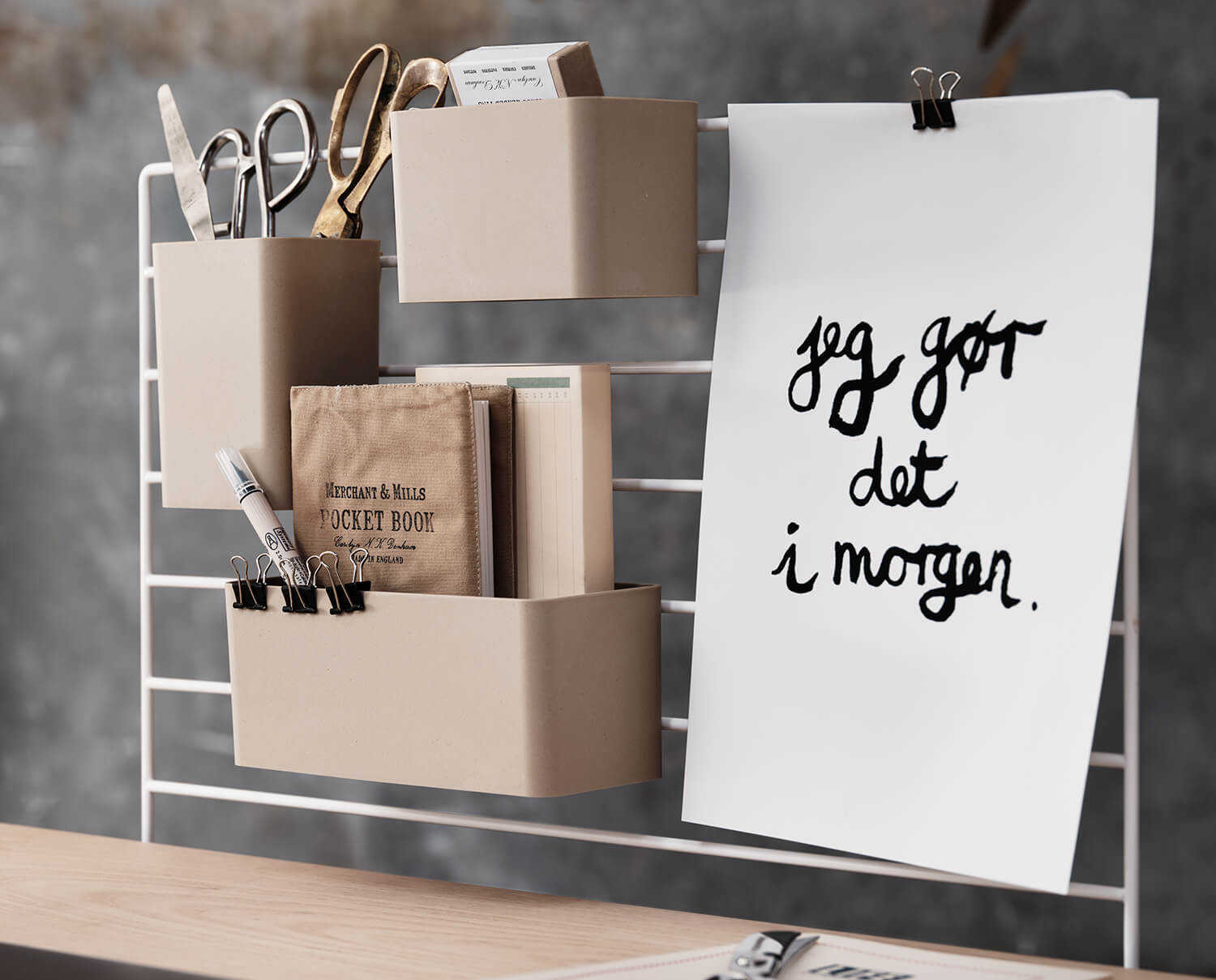 String organizers er en favorit, der er perfekt til opbevaring af penne, sakse og små notesbøger. Skufferne kan pænt hænges på siderne eller på en trådgitter for lettilgængelig opbevaring. Her monteres trådgitteret på skrivebordspladen, hvilket skaber et rent og æstetisk indtryk. Skrivebordsgitteret kan også suppleres med et filt hoved til lydisolerende og dækkende egenskaber.