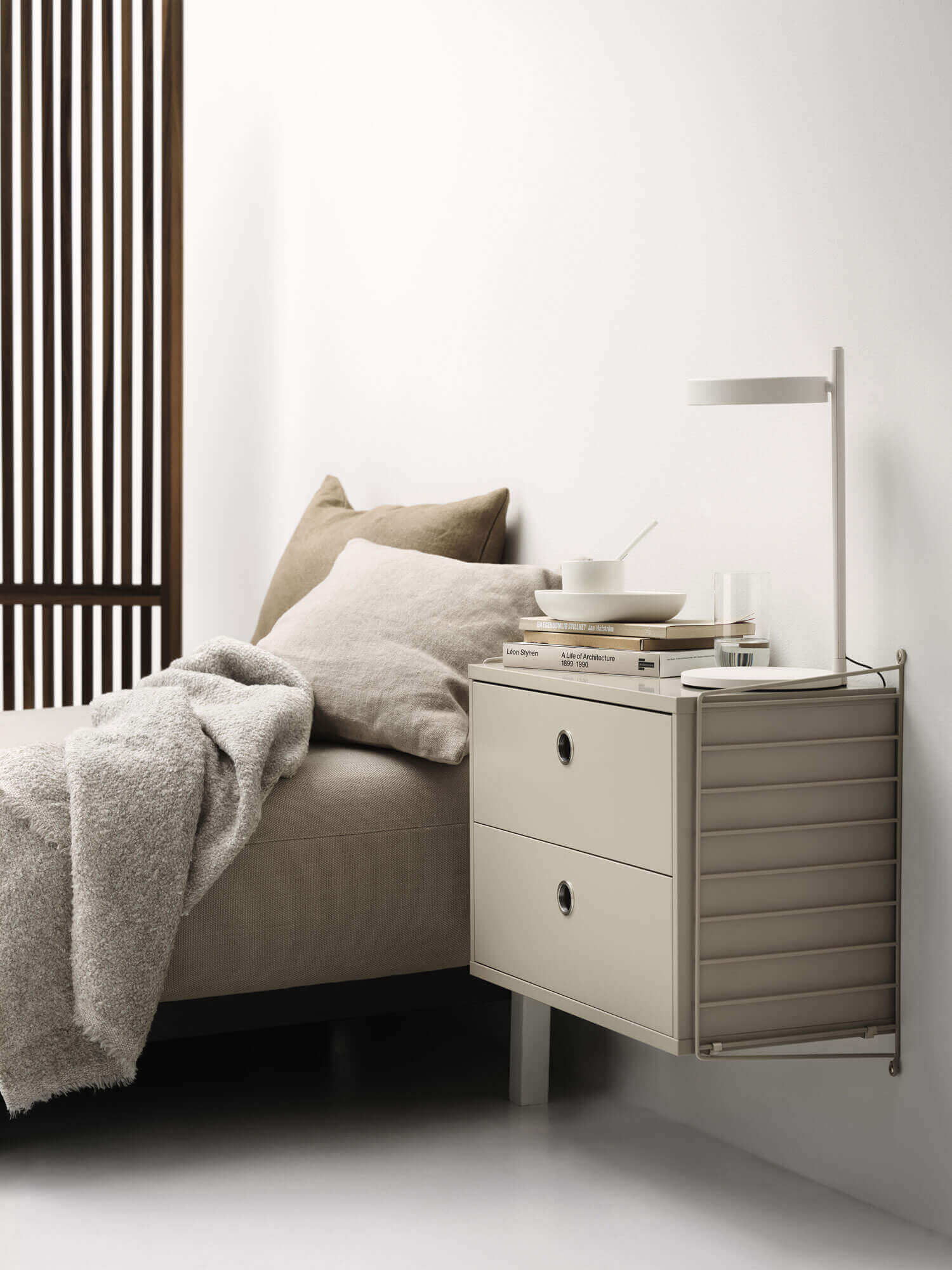 Der er nogle ting, man gerne vil have indenfor rækkevidde ved sengen, som en bog, høretelefoner og en sengelampe. Tættest på sengen passer det perfekt at placere en String skuffemodul 58x30 centimeter, som monteres på et par String væggavl 50x30 centimeter. Så får du både en afsætningsflade til sengelampen og praktisk opbevaring i form af to udtræksbare skuffer. Sengebordet bliver da et stilrent element i rummet og kan vælges i flere forskellige farver på gavle og skuffemodul. Derudover kan du tilpasse højden på natbordet efter din seng.