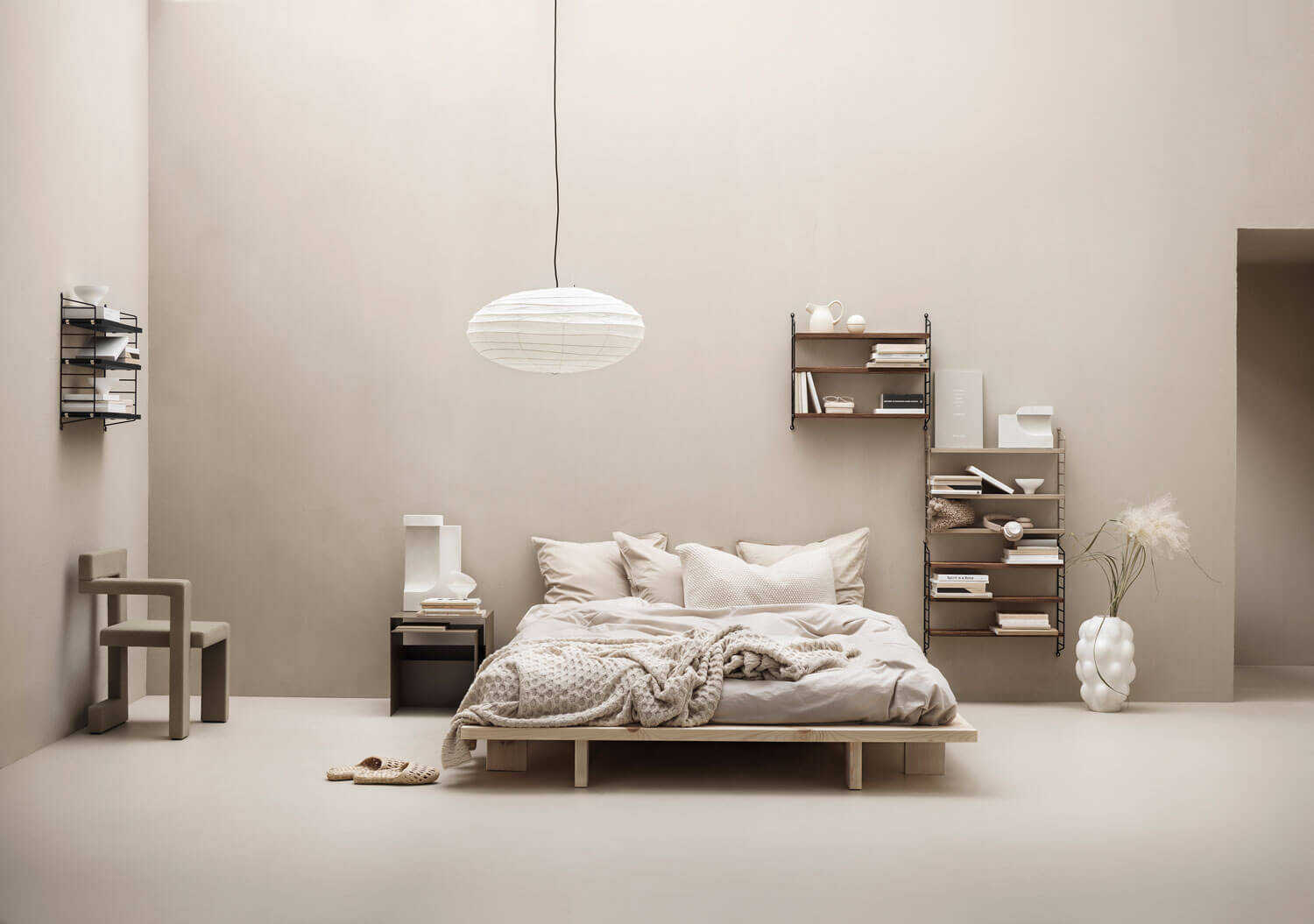 For at skabe et behageligt soveværelse til afslapning er det vigtigt med gode opbevaringsmuligheder. En boghylde fra String kan kombineres i uendelige størrelser, farver og udformninger. Hylden kan være vægmonteret eller placeres på gulvet og kan komplementeres med hylder, skabe og magasinhylder. Her kan du placere bøger, dekorativ belysning og dine yndlingsobjekter for at skabe en hjemlig og indbydende atmosfære.