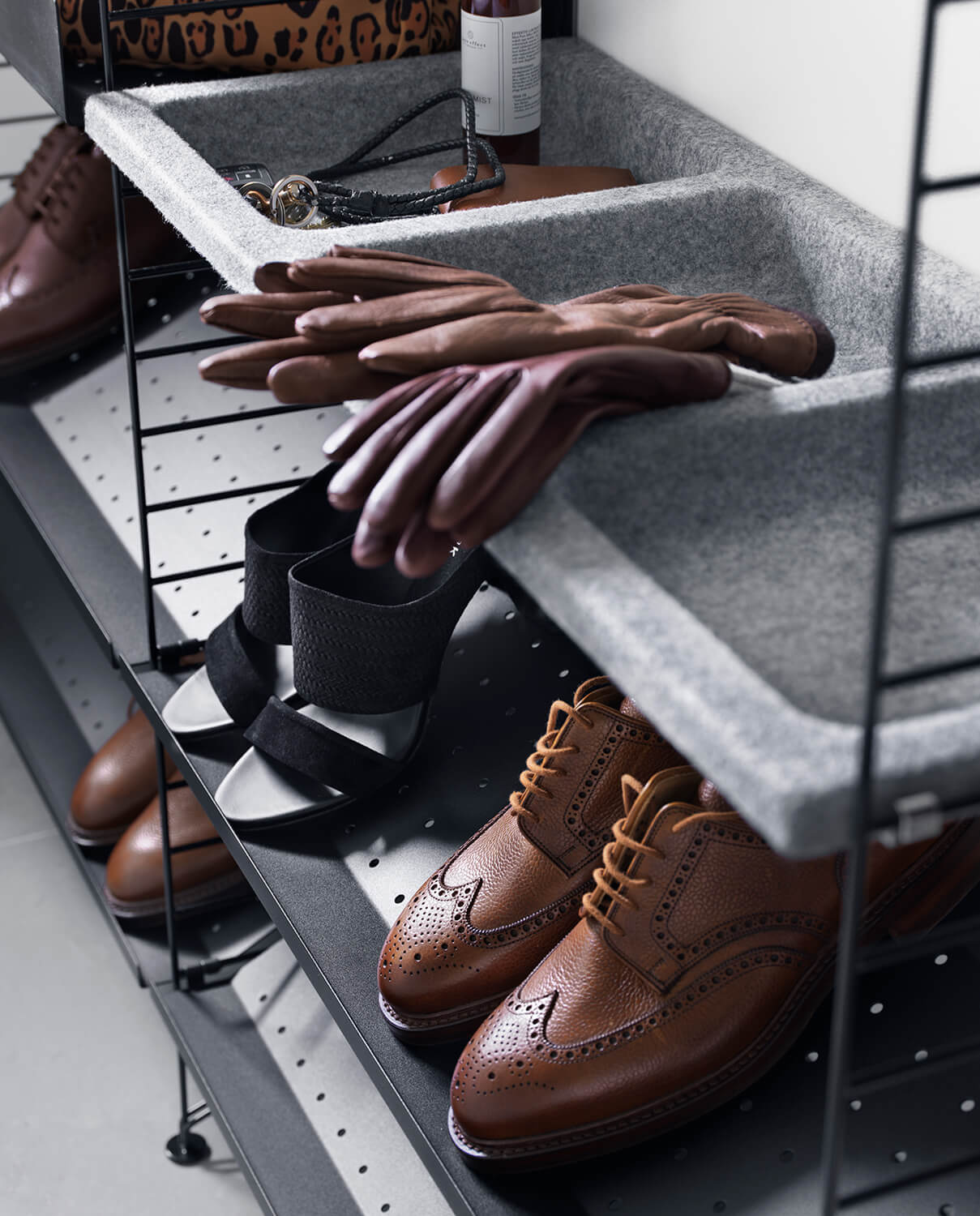 String System designet til entréen er specialudviklet til at være en praktisk og fleksibel løsning til opbevaring i entréen. Stringreolens metalhylder er perforerede, så du nemt kan bruge String Systems tilbehør som stænger og kroge. Disse placeres, hvor du ønsker det, takket være de hullede Stringhylder. Dit behov bestemmer, hvor mange kroge og stænger du monterer på din Stringreol. Hylder, der er designet til entréen, er lavet af metal, hvilket gør dem nemme at holde rene ved at støvsuge og tørre af regelmæssigt.