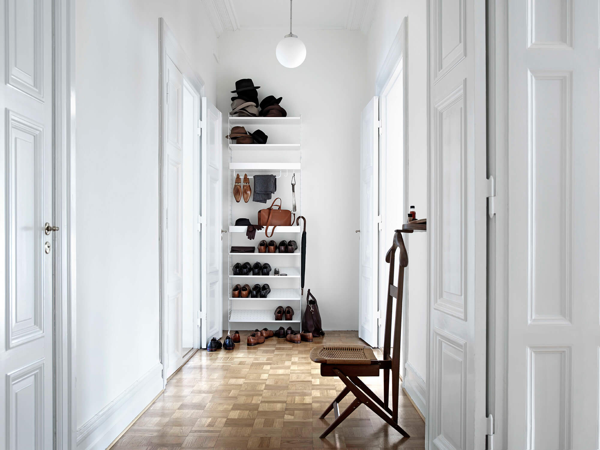 Stringhylden passer også perfekt til at have som hylde sektion bag skydedøre i entréen. Reolen er så tilpasningsdygtig, at du nemt kan vælge String dele, så det passer til din entré garderobe. Her har du muligheden for at skabe orden i tøj og sko bag de lukkede døre