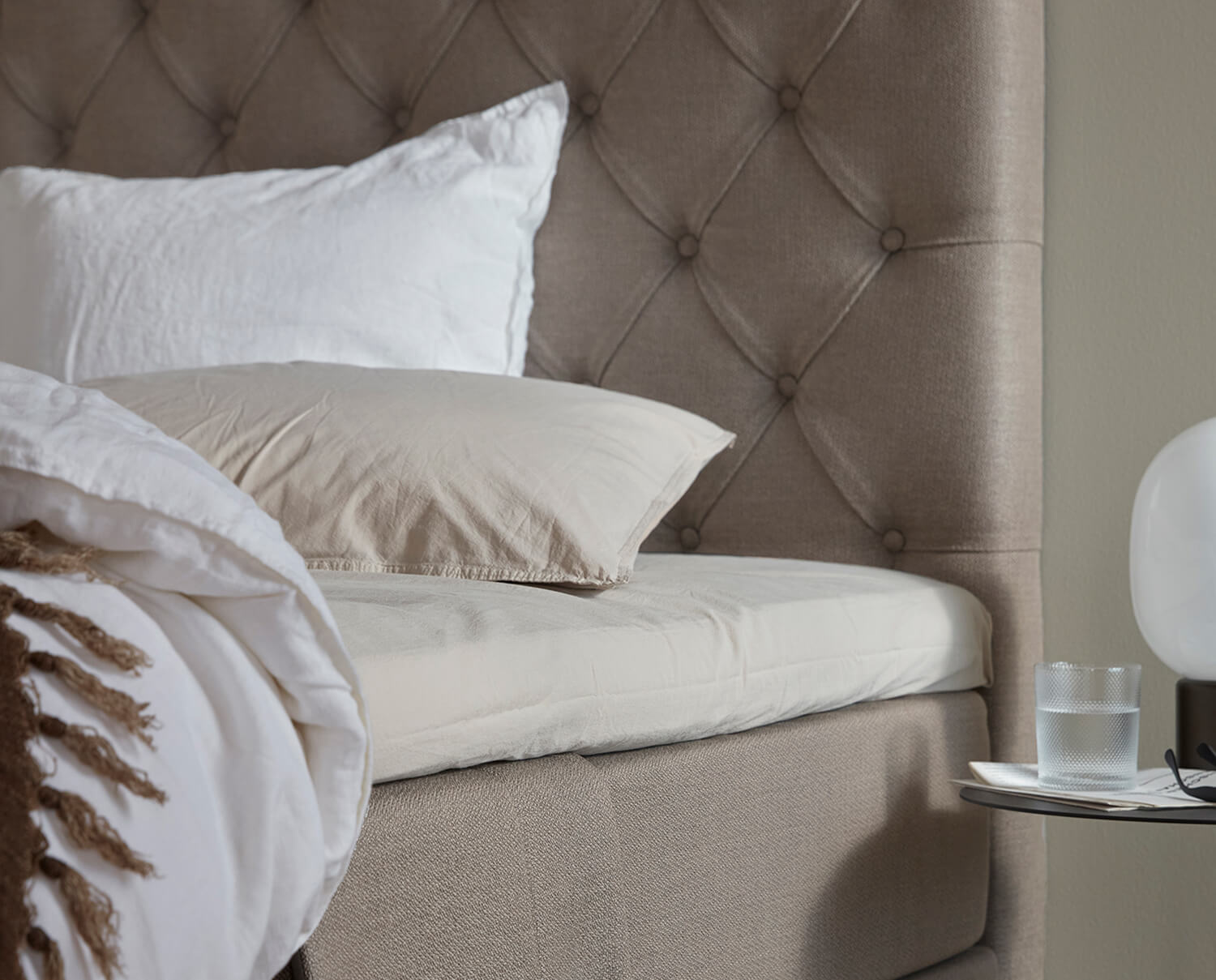 Hvis du ønsker en seng med lang levetid, er det smart at investere i en topmadras af høj kvalitet. En topmadras forlænger levetiden på madrassen, der er placeret under, da den beskytter mod slid og fugt. Pas på topmadrassen ved at vende den 3-4 gange om året. Vend den både op-og-ned og langs hoved- og fodenden for at skabe et jævnt slid og lade madrassen få luft. Støvsug også alle sengens madrasser og tilbehør, såsom sengegavl og opbevaringslommer med jævne mellemrum. På denne måde forhindres snavs og støv i at trænge ind i madrasserne. Hvis du har en terrasse eller altan, vil både topmadrasser og dyner have godt af at blive luftet udendørs i den friske luft.