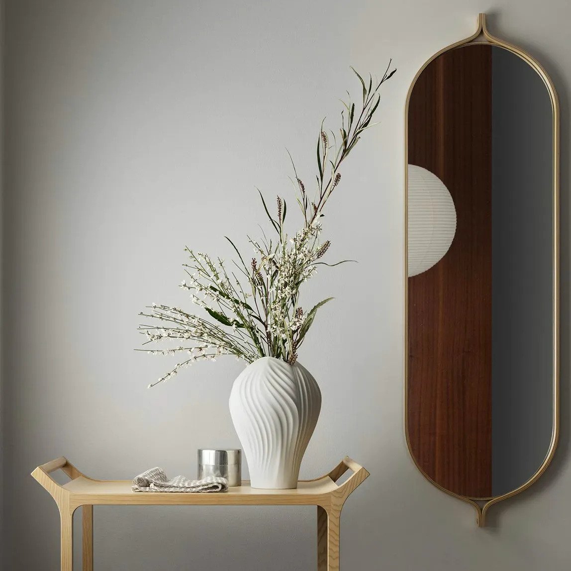 Gardiner, der hænger fra gulv til loft, er en simpel måde at få rummet til at føles større end det er. Hæng gardinerne uden for vinduet, foran væggen, for at maksimere lysindfaldet. Gardinerne må gerne være lavet af et tykt, tungt stof, der giver den luksuriøse hotelstemning. I vinduet vil vi gerne se dejlige stilleben af planter, lamper og smukke indretningsdetaljer. Husk at arbejde med kontraster for at skabe balance: højt mod lavt, hårdt mod blødt og et ulige antal.
